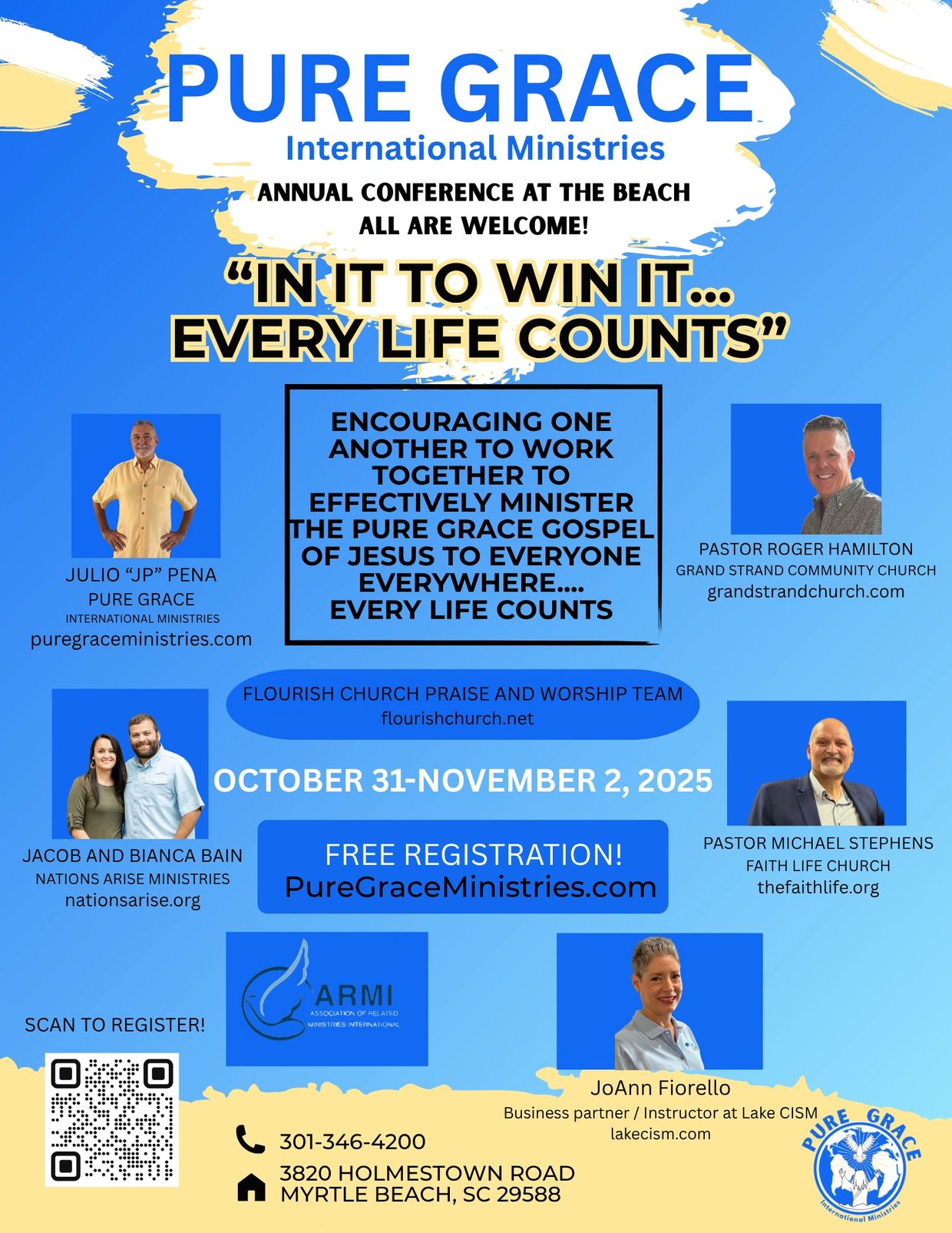 Encouraging one another to work together to effectively minister the Pure Grace Gospel of Jesus to everyone everywhere....every life counts!